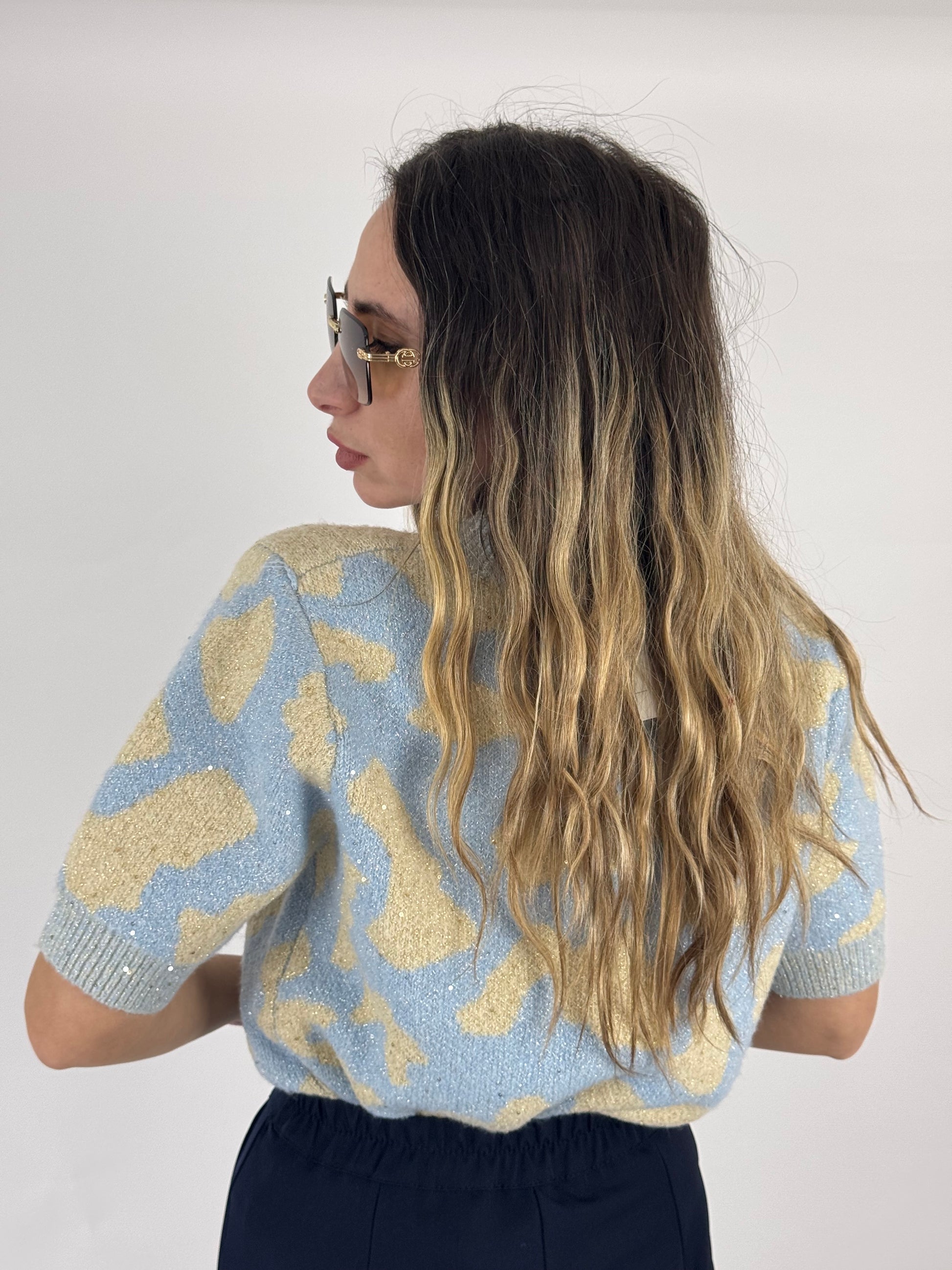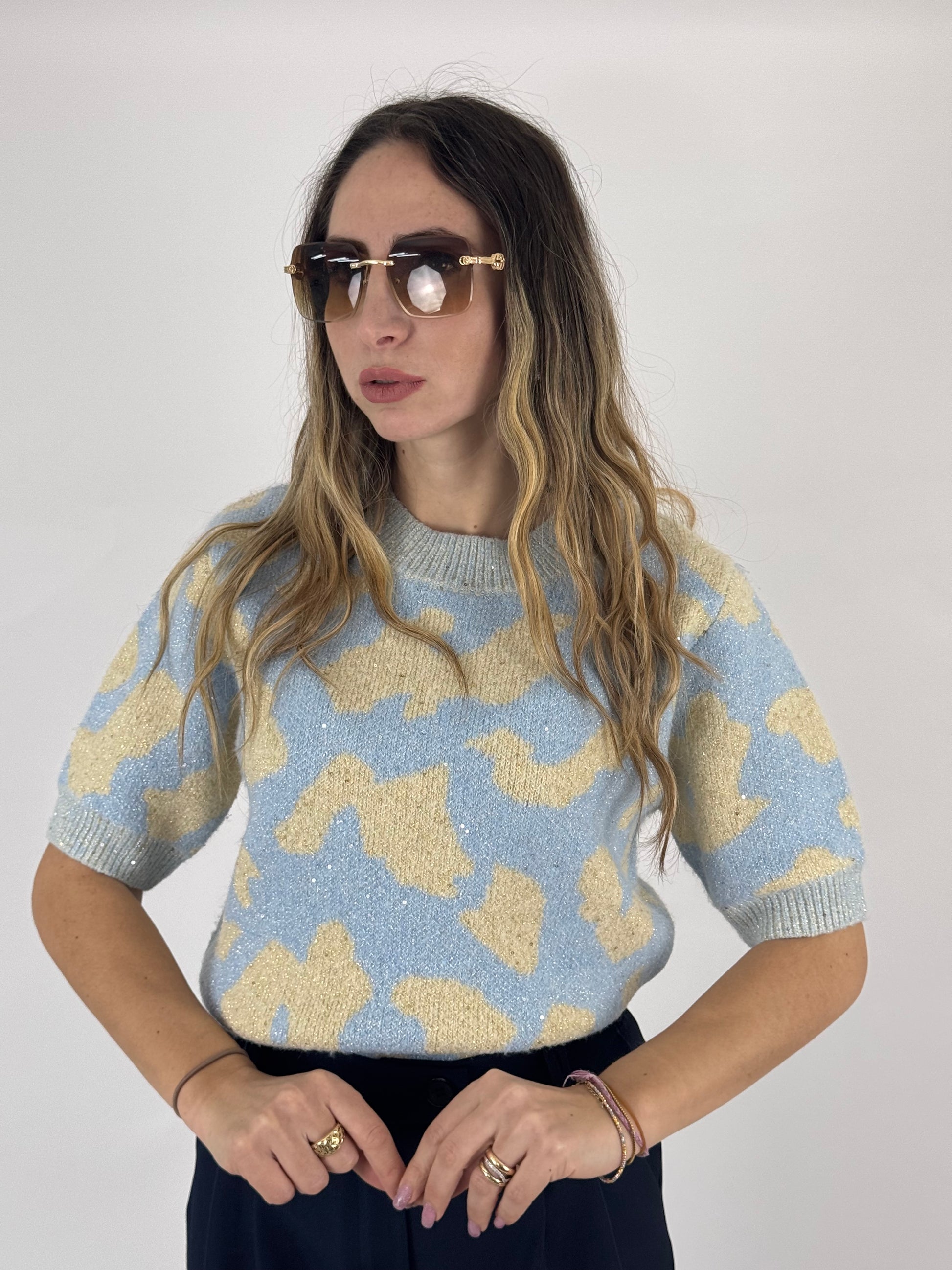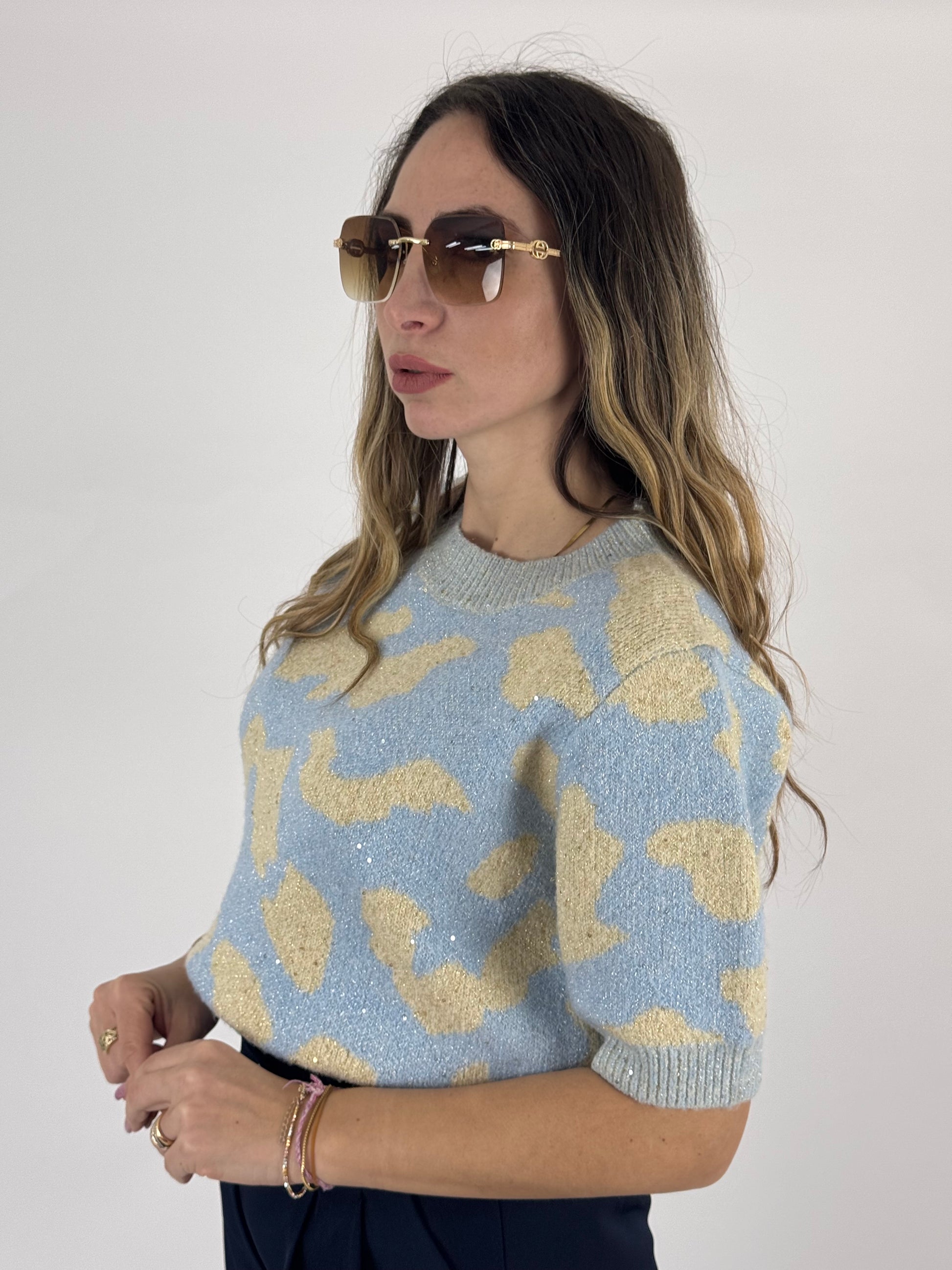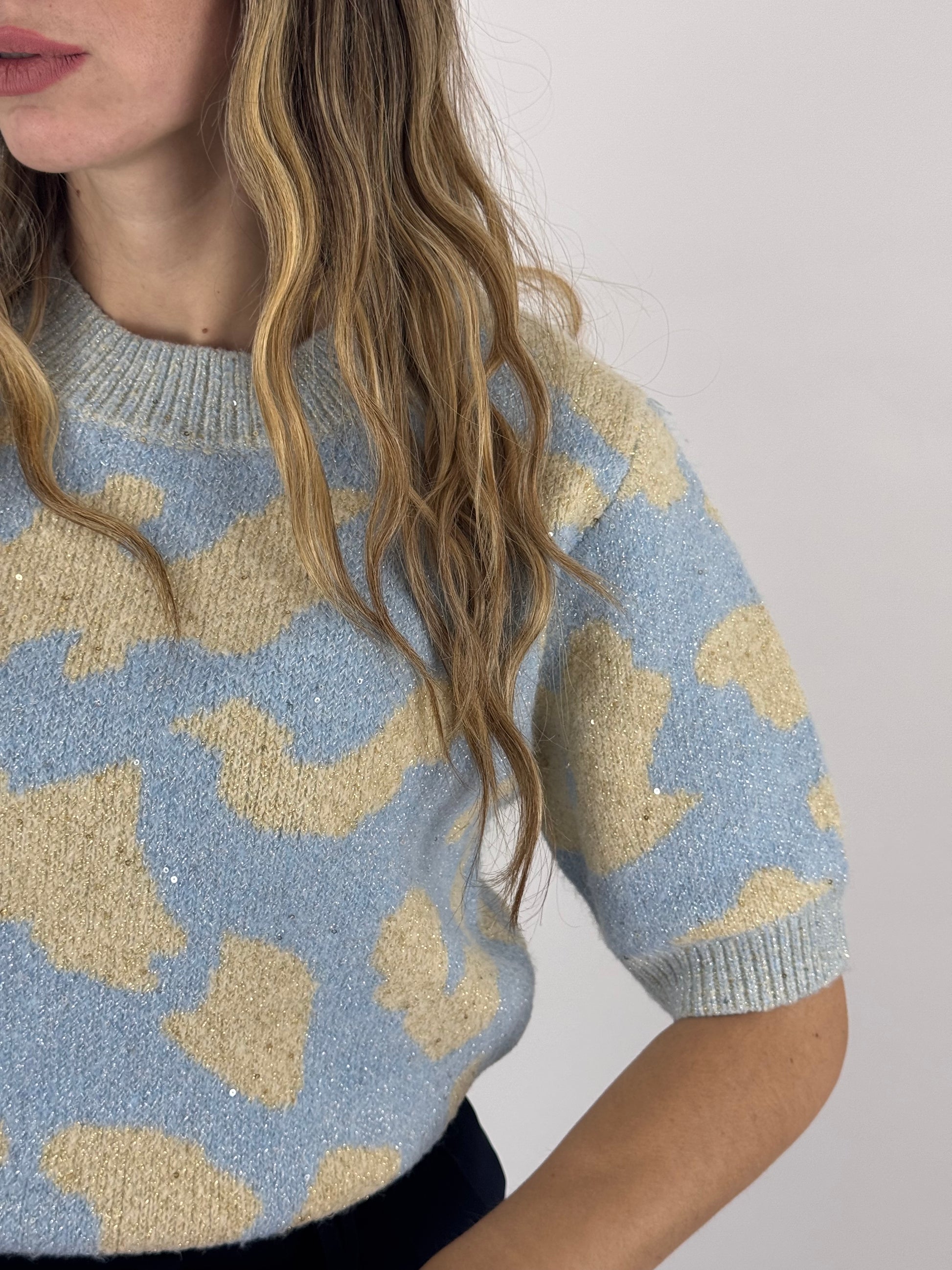 Maglioncino mezza manica, effetto lana morbida, con applicazione di paillettes