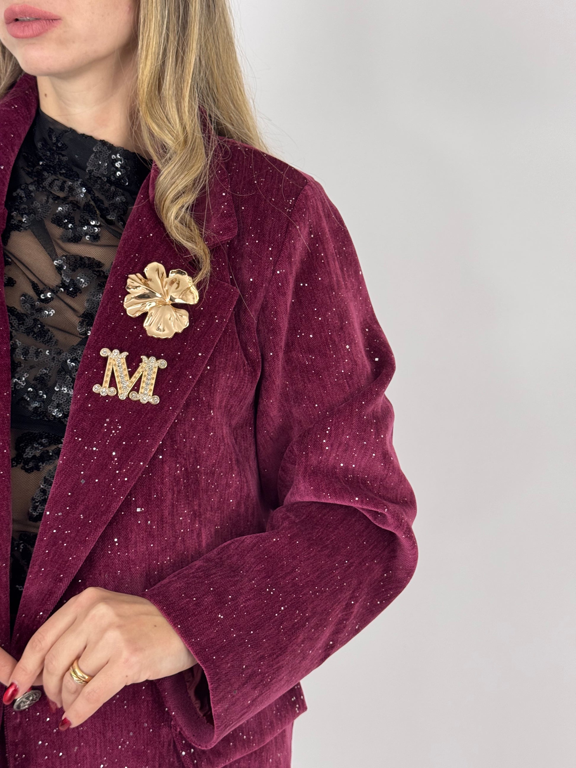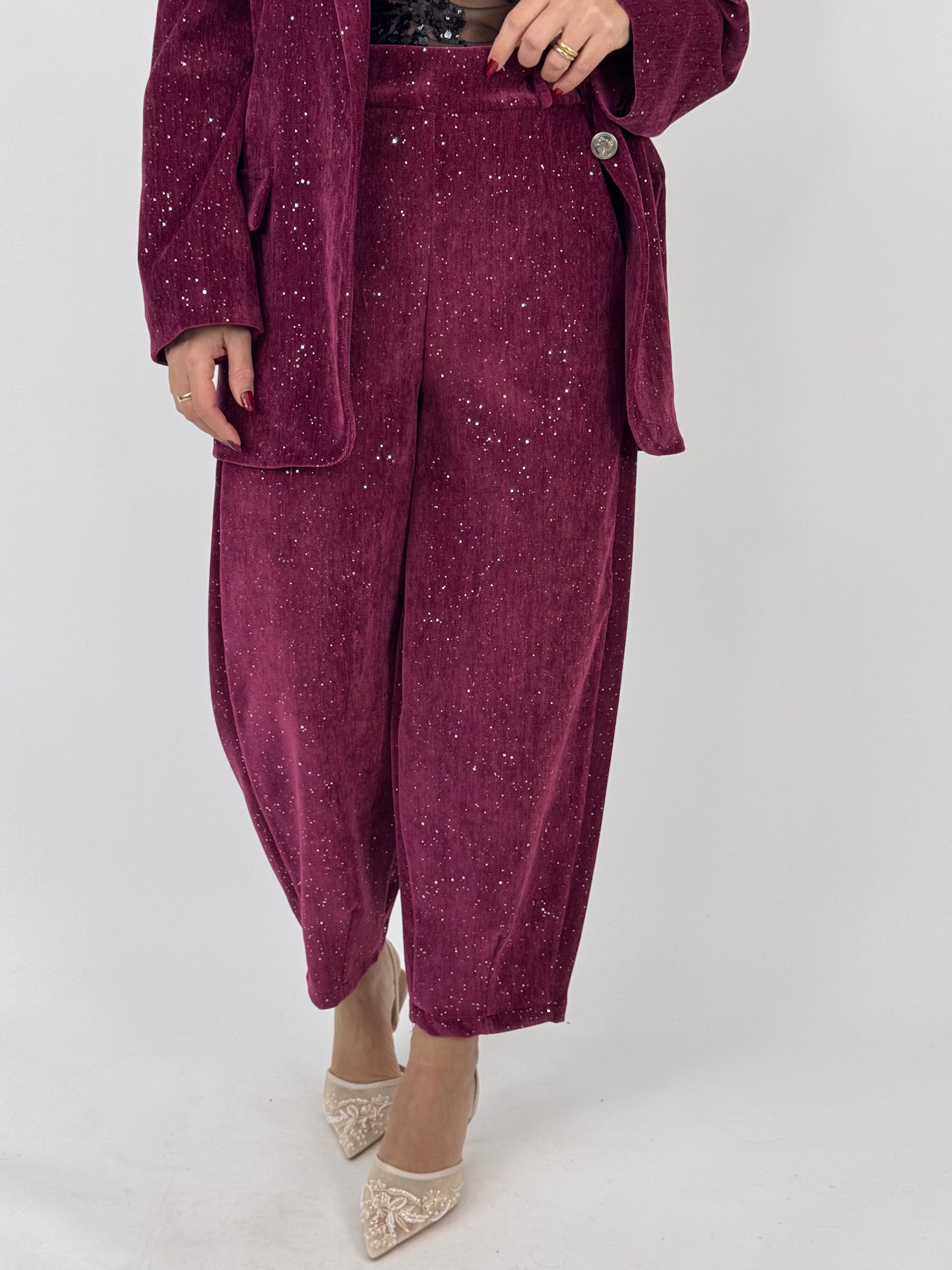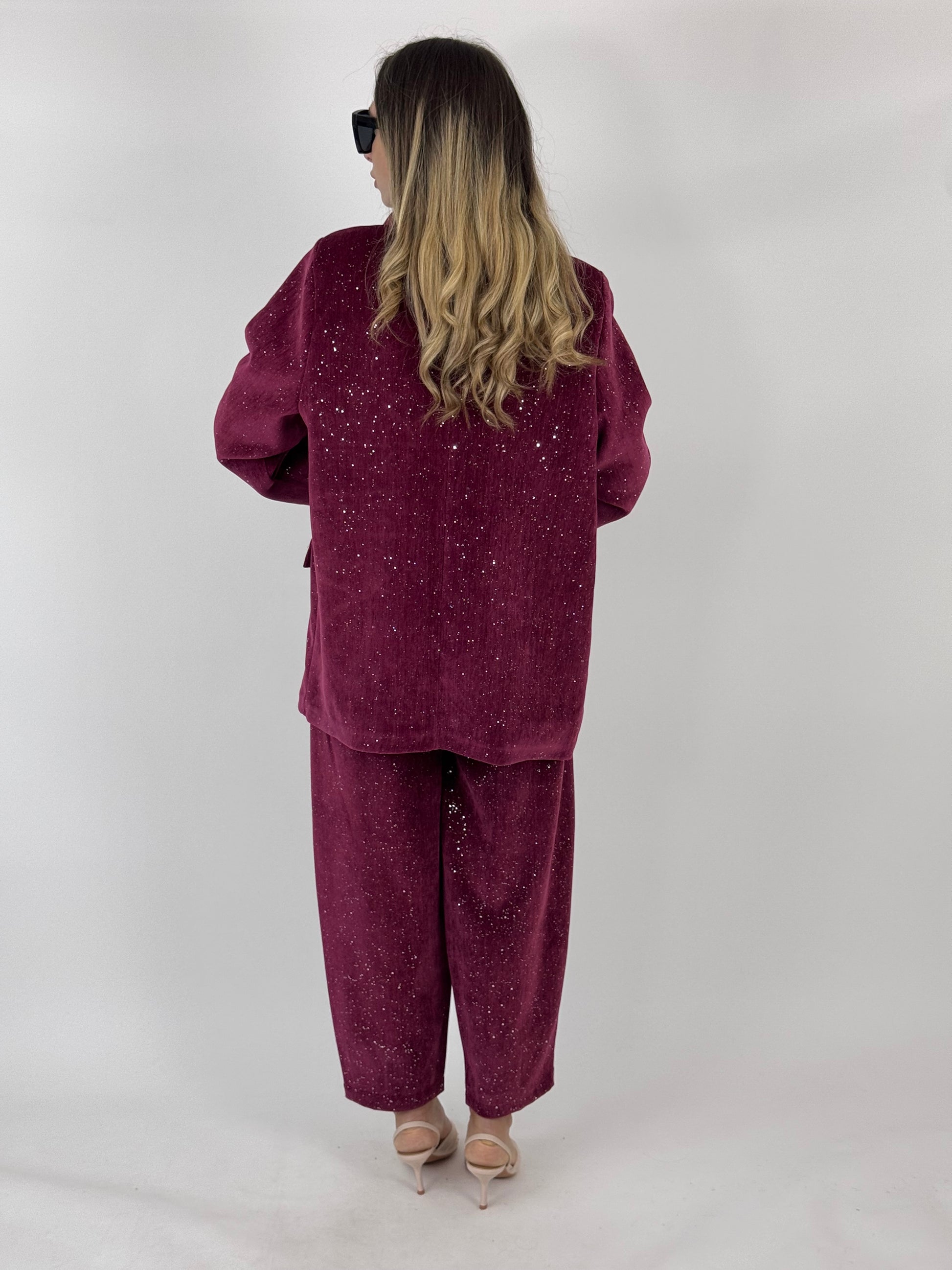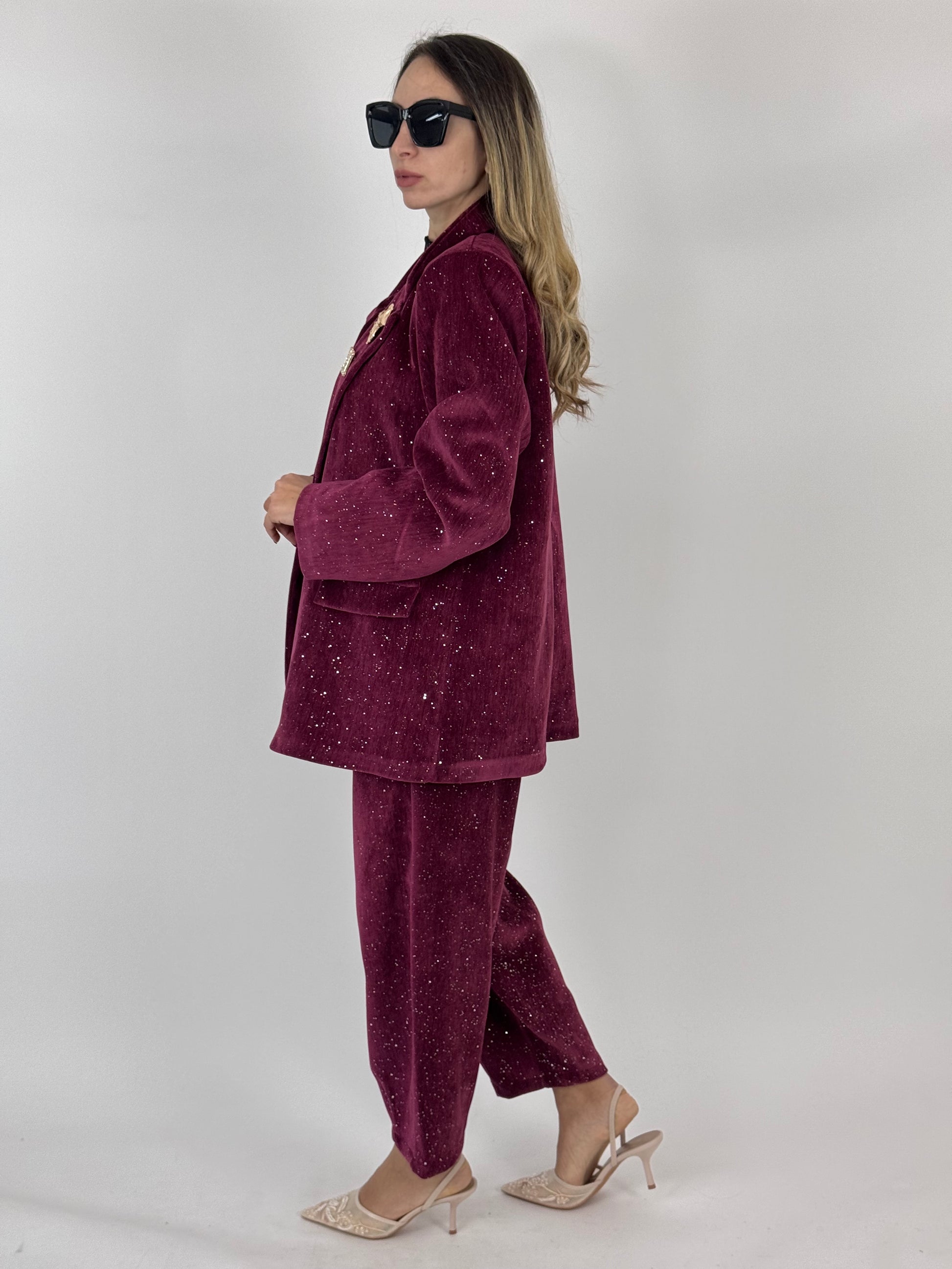 Tailleur in velluto con apploicazione di punti luce, pantalone con elastico nel retro, giacca con spille incluse